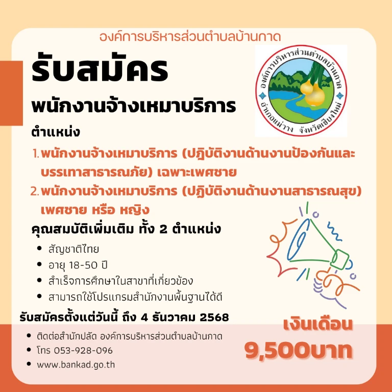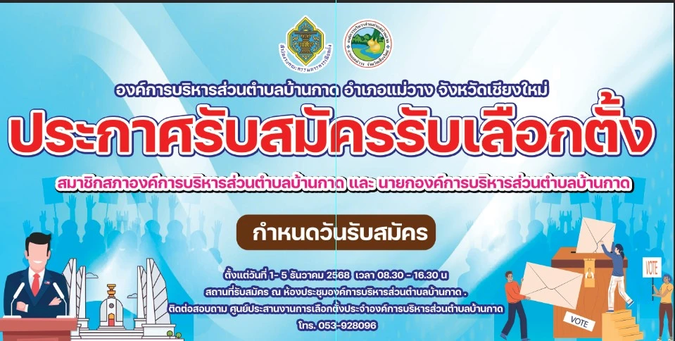 ประกาศรับสมัครรับเลือกตั้ง สมาชิกสภาองค์การบริหารส่วนต่าบลบ้านกาด และ นายกองค์การบริหารส่วนต่าบลบ้านกาดประกาศรับสมัครรับเลือกตั้ง สมาชิกสภาองค์การบริหารส่วนต่าบลบ้านกาด และ นายกองค์การบริหารส่วนต่าบลบ้านกาด ในระหว่าง วันที่ 1-5 ธันวาคม 2568 เวลา 08.00-16.30น.